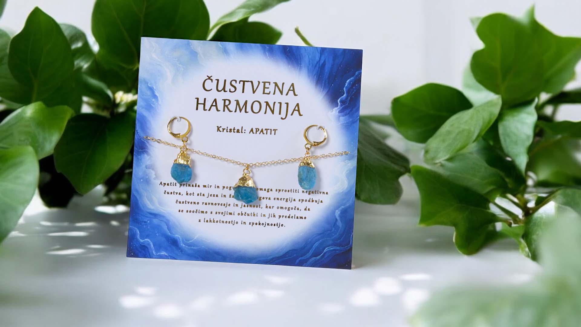 This energy set with a necklace and earrings featuring apatite is designed to support emotional clarity, inner peace and the release of negative emotions. Apatite helps to let go of anger and sadness while encouraging a balanced connection with one’s feelings. Its energy brings a deep sense of calm, lightness, and emotional stability. An excellent choice as a personal talisman – or as a gift for someone in need of emotional support and inner harmony.