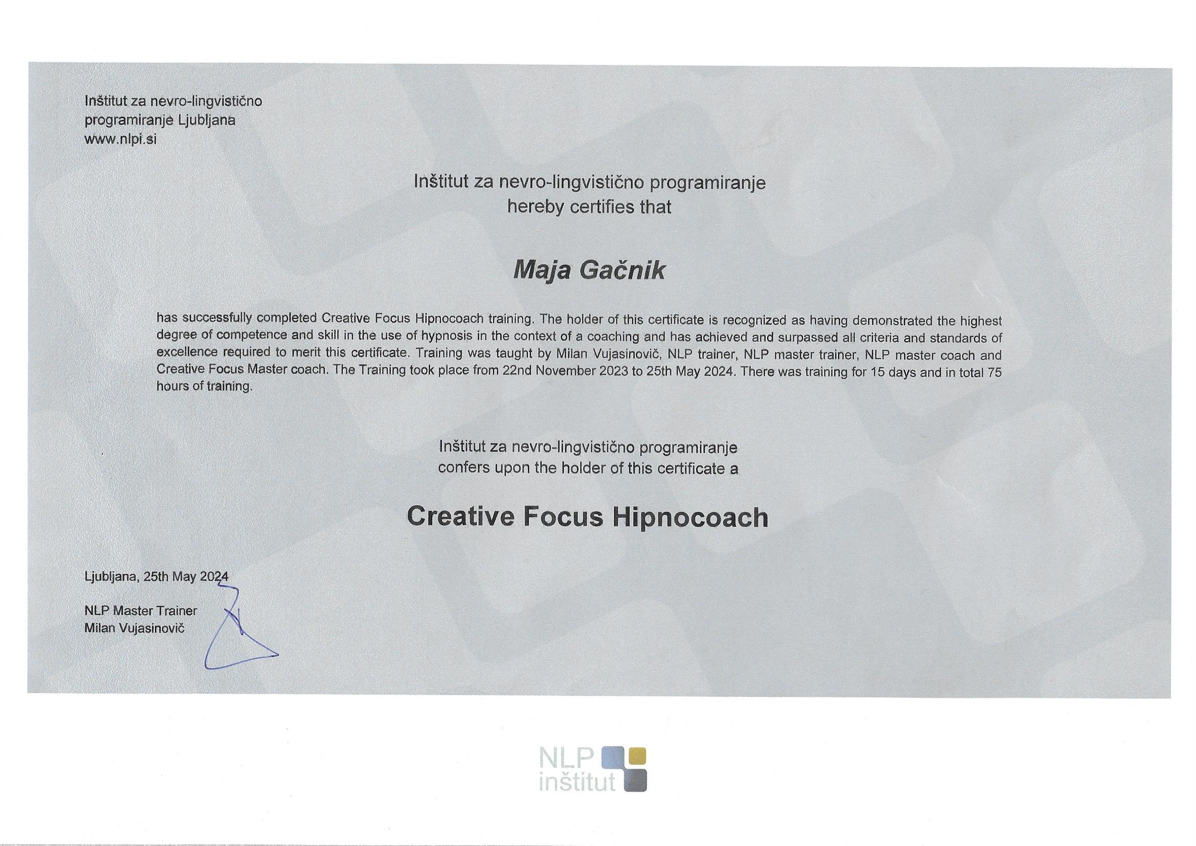 S hipnozo sem se prvič srečala pred več kot desetimi leti in bila popolnoma fascinirana nad njeno učinkovitostjo. Takrat sem opravila tečaj avtohipnoze, ki me je vodil na pot nadaljnjega raziskovanja. V naslednjih letih sem obiskovala številne seminarje in delavnice, med njimi tudi tečaje nevrolingvističnega programiranja (NLP) in hipnoze. V letih 2023/2024 sem se izobraževala za hipnoterapevtko pri priznanem strokovnjaku Milanu Vujasinoviću. Poleg tega sem svoje znanje nadgrajevala tudi s pomočjo številnih strokovnih knjig, kar mi omogoča celovit in poglobljen pristop pri delu.